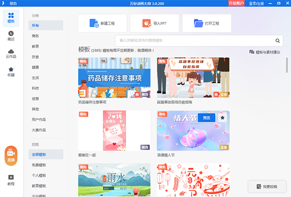 2. 海量精美动画模板。大量简洁大方的动画模板,涵盖多个主题内容,轻松下载并替换模板内容便可快速制作出酷炫的动画宣传视频、微课视频等。
