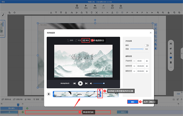 新建工程,导入需要拆分的视频,并在画布中调整导入视频的大小,然后双击视频“行”空白处,弹出“视频编辑器”窗口,在视频下方的时间轴上将“开始时间线”、“结束时间线”拖动到视频切割时间点上,或者在右侧输入开始时间、结束时间,然后选择上方【拆分】,设置好音量后点击【确定】即可。