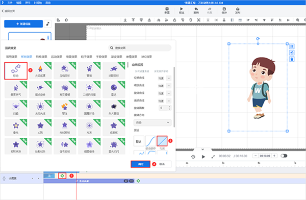 新建工程,在画布中添加带有走路动作的角色,选择【+】添加强调效果,弹出默认窗口选择【移动】,移动速度选择右侧【匀速】效果,点击【确定】。