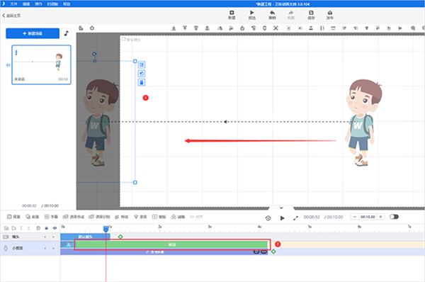 人物移动到镜头外,然后把移动滑块拉到与人物的动作滑块对齐,然后点击预览效果即可。