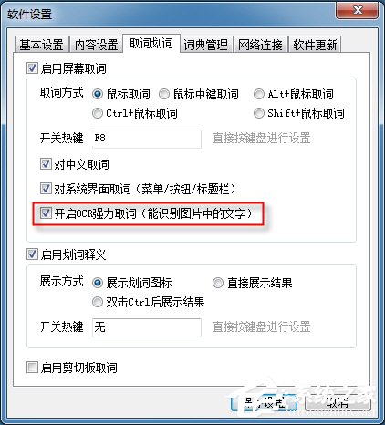 如果您需要启用该功能,点击词典主窗口右上角的程序菜单按钮,在“设置-软件设置-取词划词”中,勾选“开启OCR强力取词”即可。